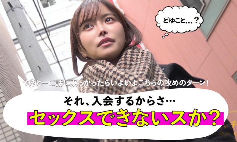 「入会するからSEXさせてください!」——この一言で始まる、ある意味社会風刺AV。街中で出会ったマルチ商法女子に逆ナン気味に声をかけられ、まさかのSEX交渉で本番に持ち込むという、悪ノリ極まるコンセプト。
